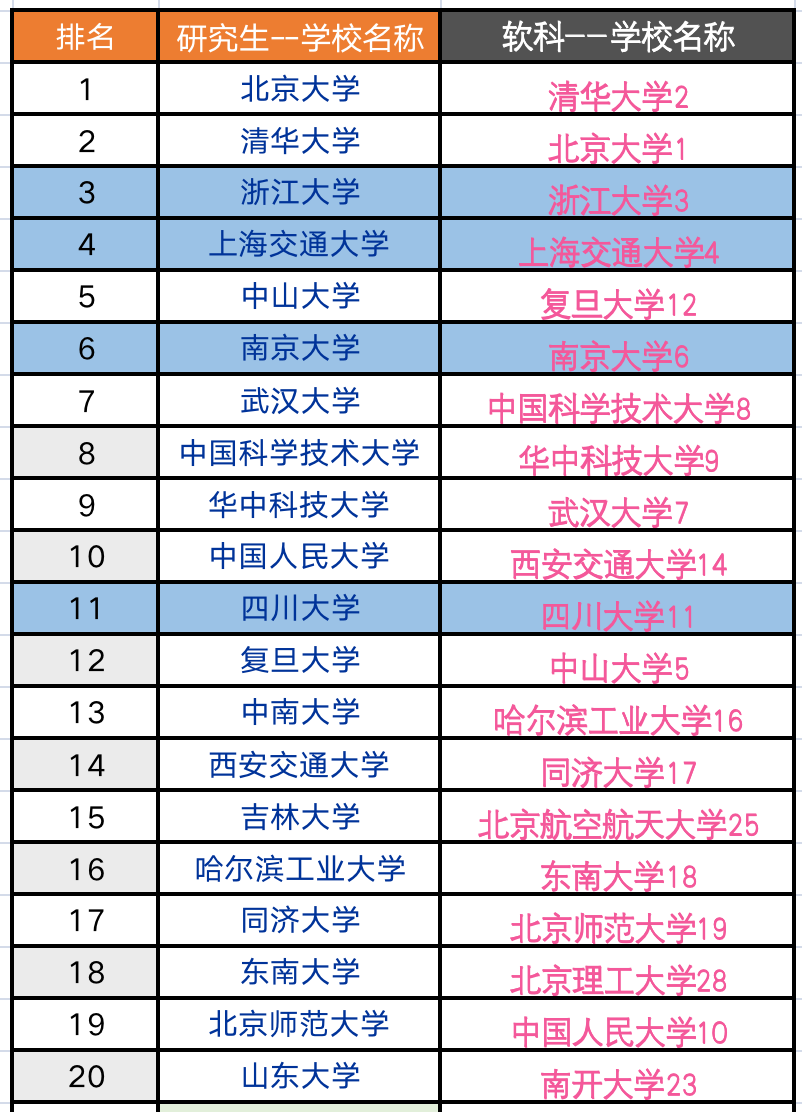 从名单对比可以看出两个不同指标下排名相同的只有5个:第三名浙江大学、第四名上海交通大学、第6名南京大学、第11名四川大学、第26名厦门大学,可见这几所高校的各方面实力还是非常稳的!