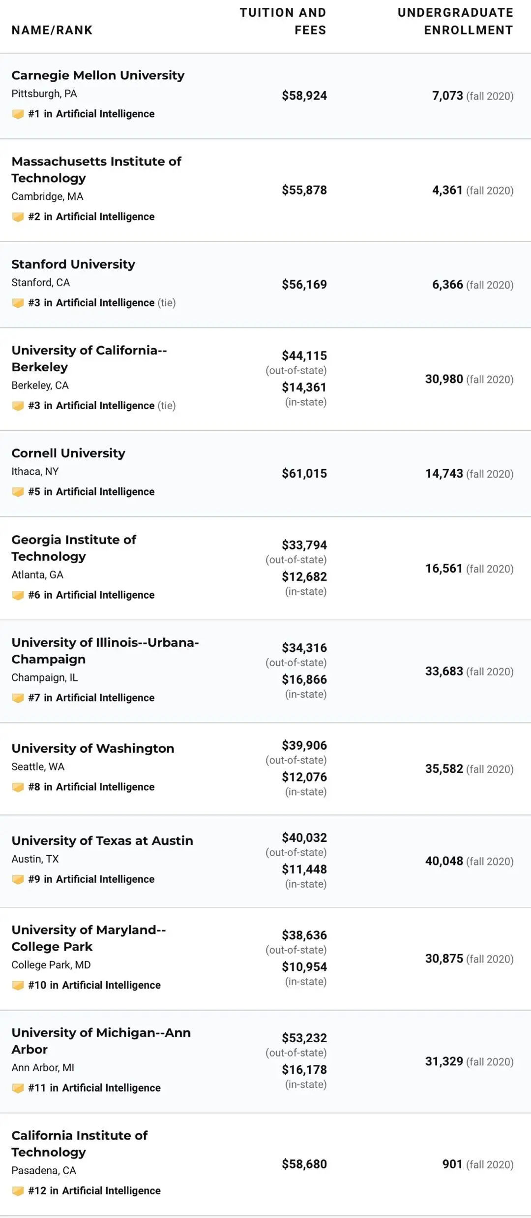 CMU位列第1,MIT排名第2,斯坦福和UCB并列第3。