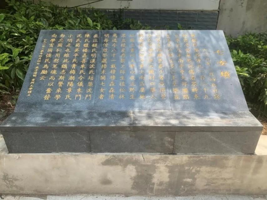 七女坟位于贵州大学南校区松涛路校门处,为钱明汉、沈培筑、陈馥椿、朱令仪、沈菊英、平青梅、章小明七位贵阳女中学生的合葬墓。民国二十八年(1939年)2月4日,日军18架轰炸机经广西大溶口向贵阳发起了大轰炸,共投弹129枚,史称“二·四轰炸”,从贵阳女中逃亡至花溪的七位女学生不幸遇难,当地村民就近将七位女学生安葬在石园村口,即今贵州大学南校区属地。2020年4月,贵州大学在原墓地旁立七女坟碑,以追忆逝者、警示后人。