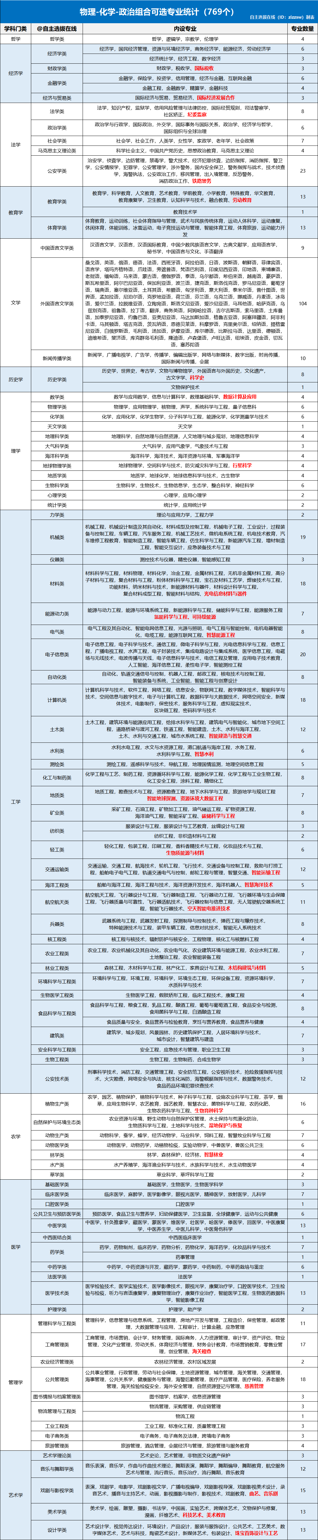 自主选拔在线根据教育部公布的选科指引文件,对“物理+化学+政治”等20个选科组合的专业覆盖率(由高到低排列)进行了计算,供广大低年级考生参考。