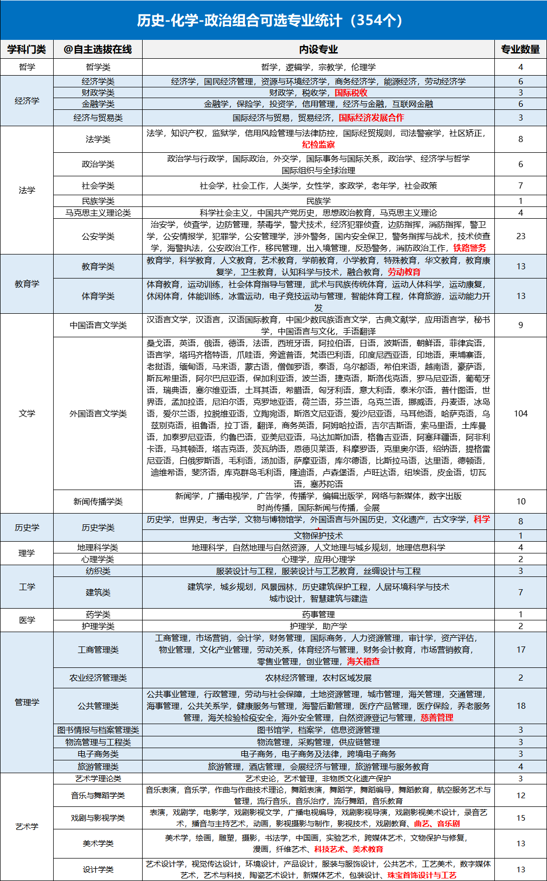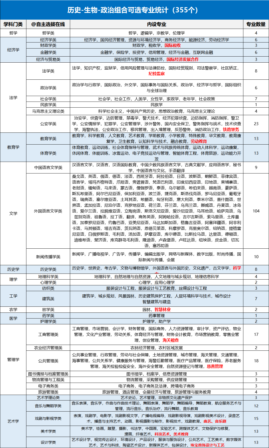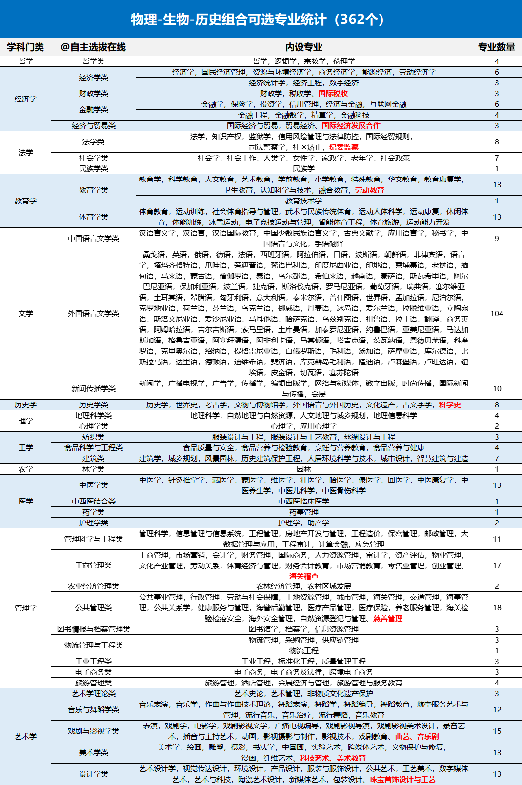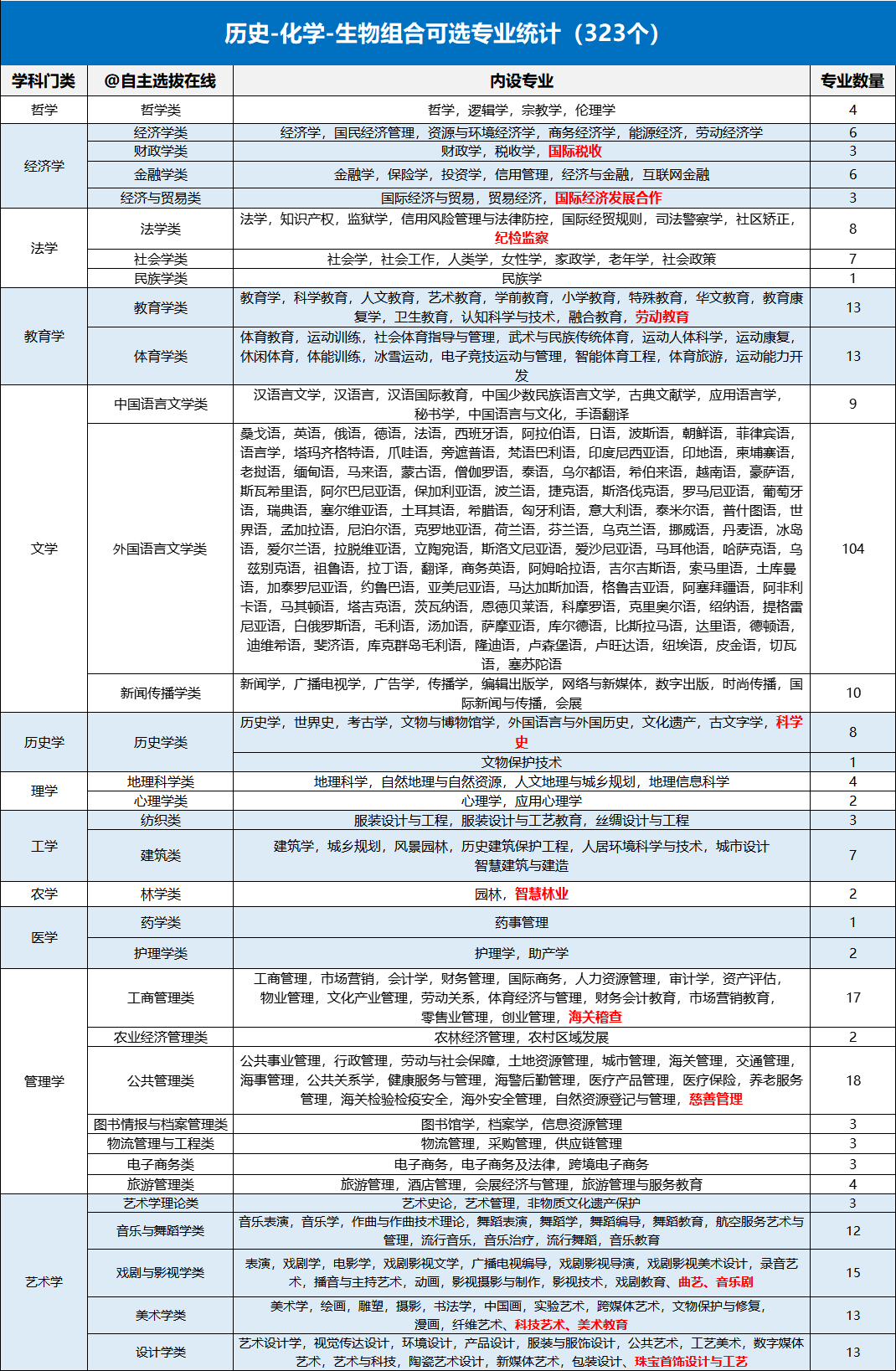 物理-生物-历史组合要求考生具备较好的记忆力,可选专业集中在文学、管理学、经济学及部分医学、理学、工学专业。