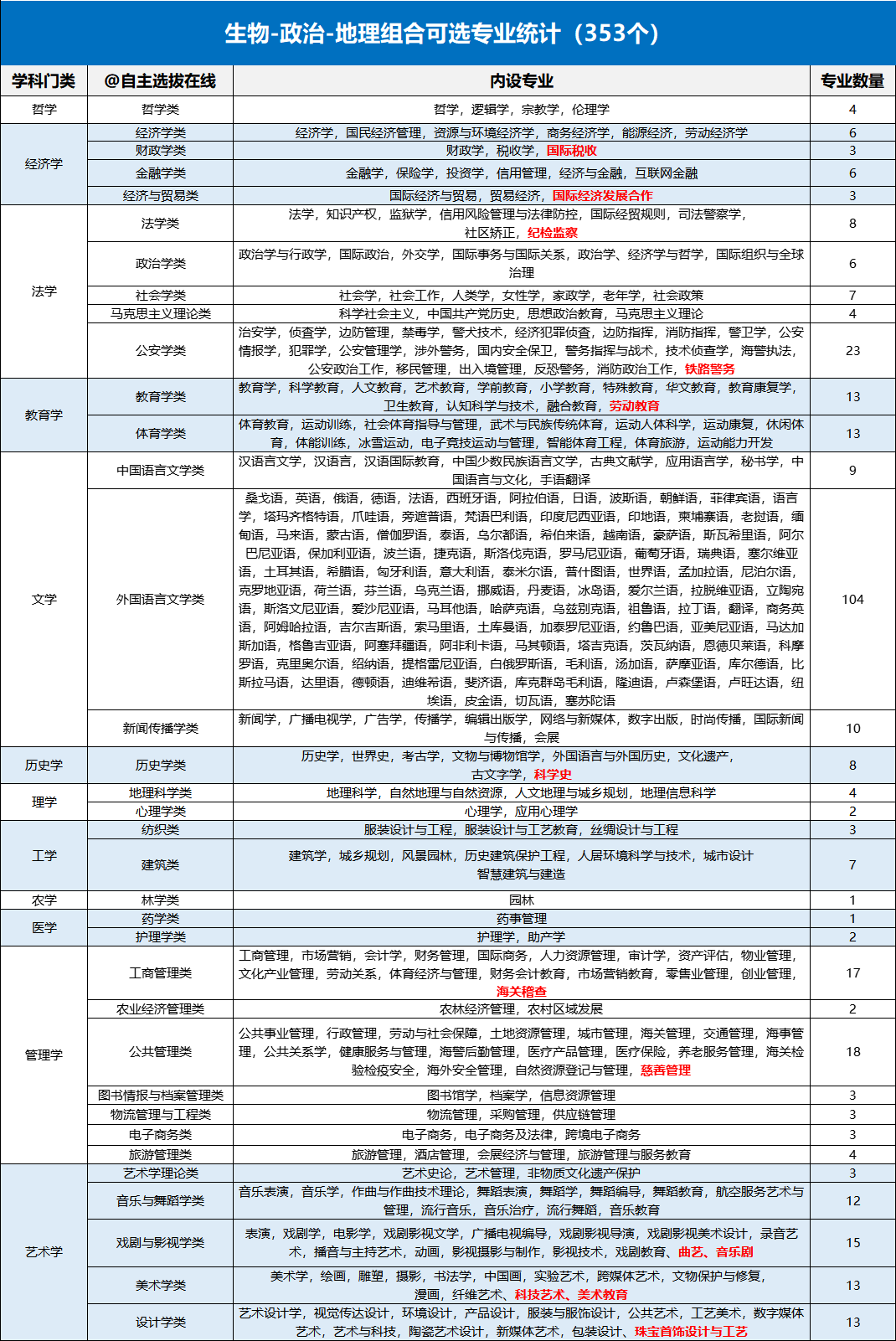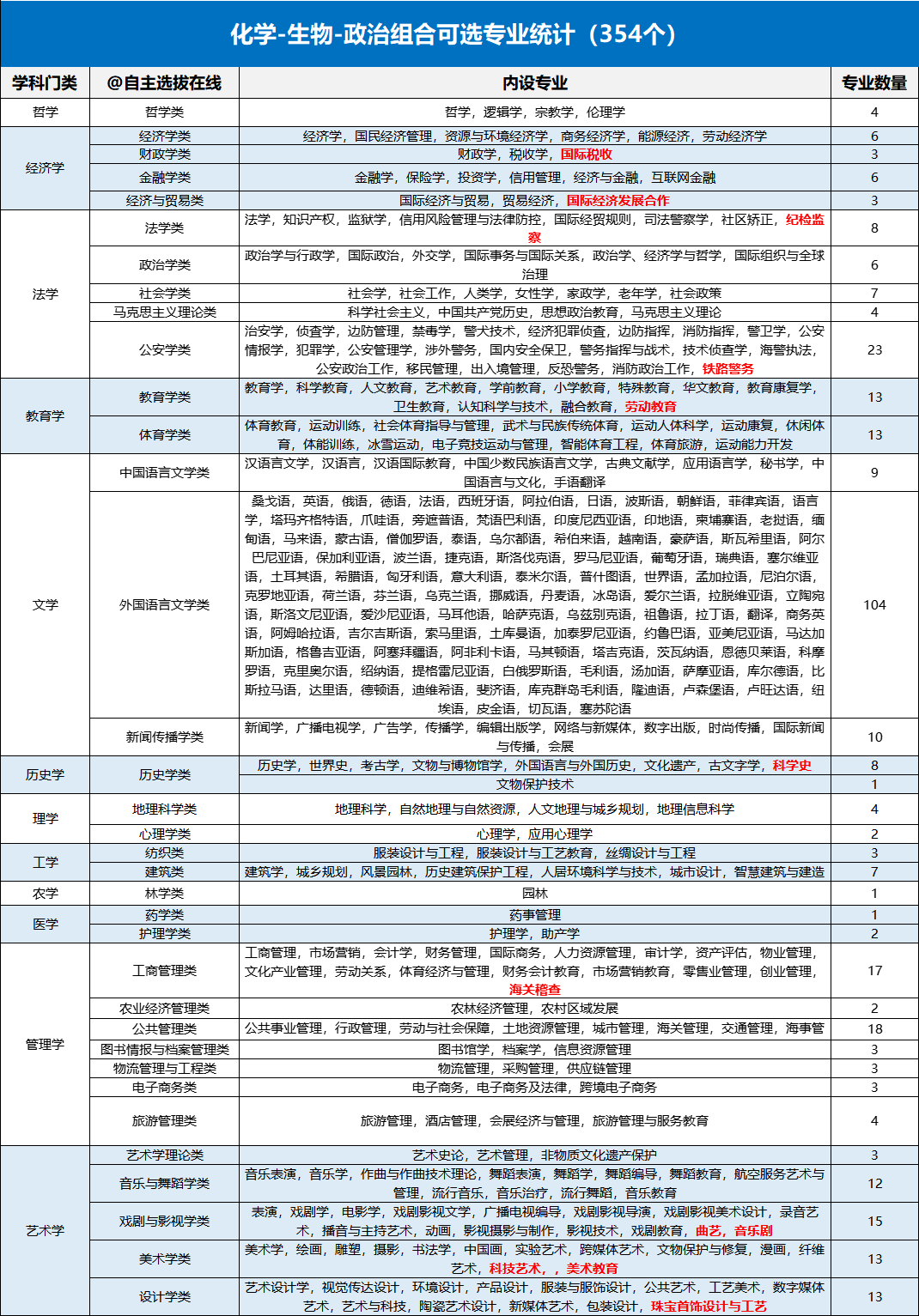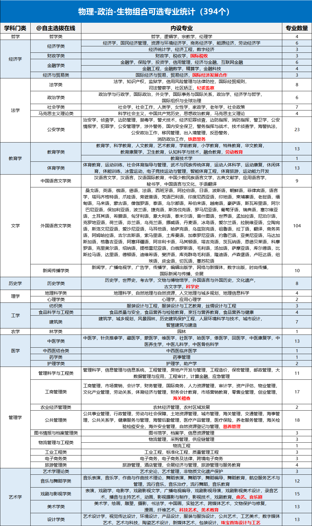 物理-政治-生物组合专业覆盖面有所下降,但经济类、管理类、农学类、医学等专业仍选择之列。
