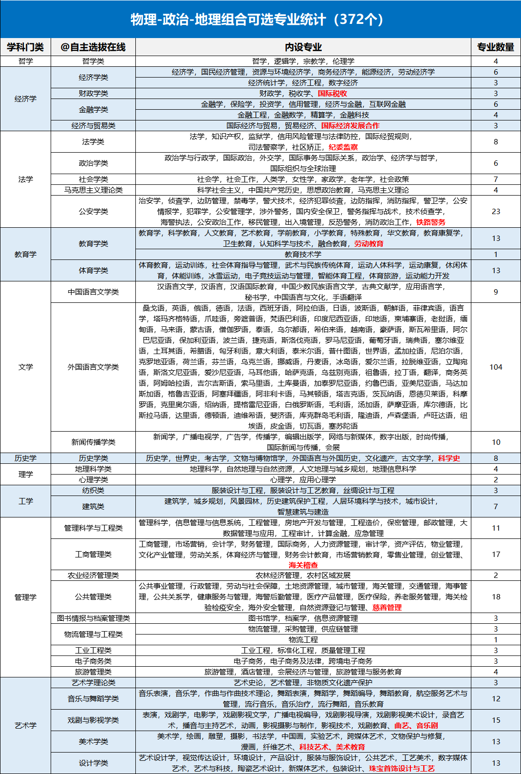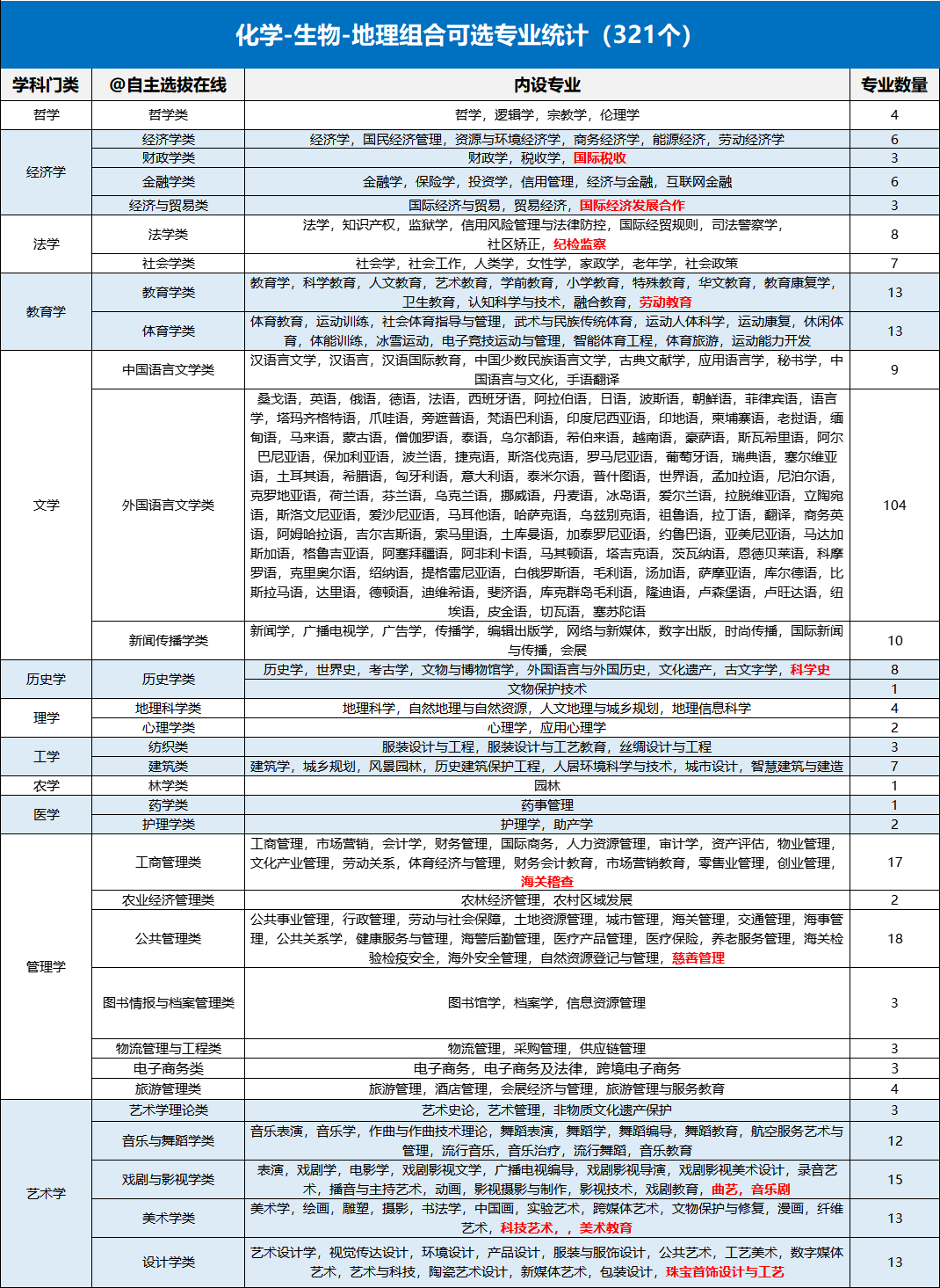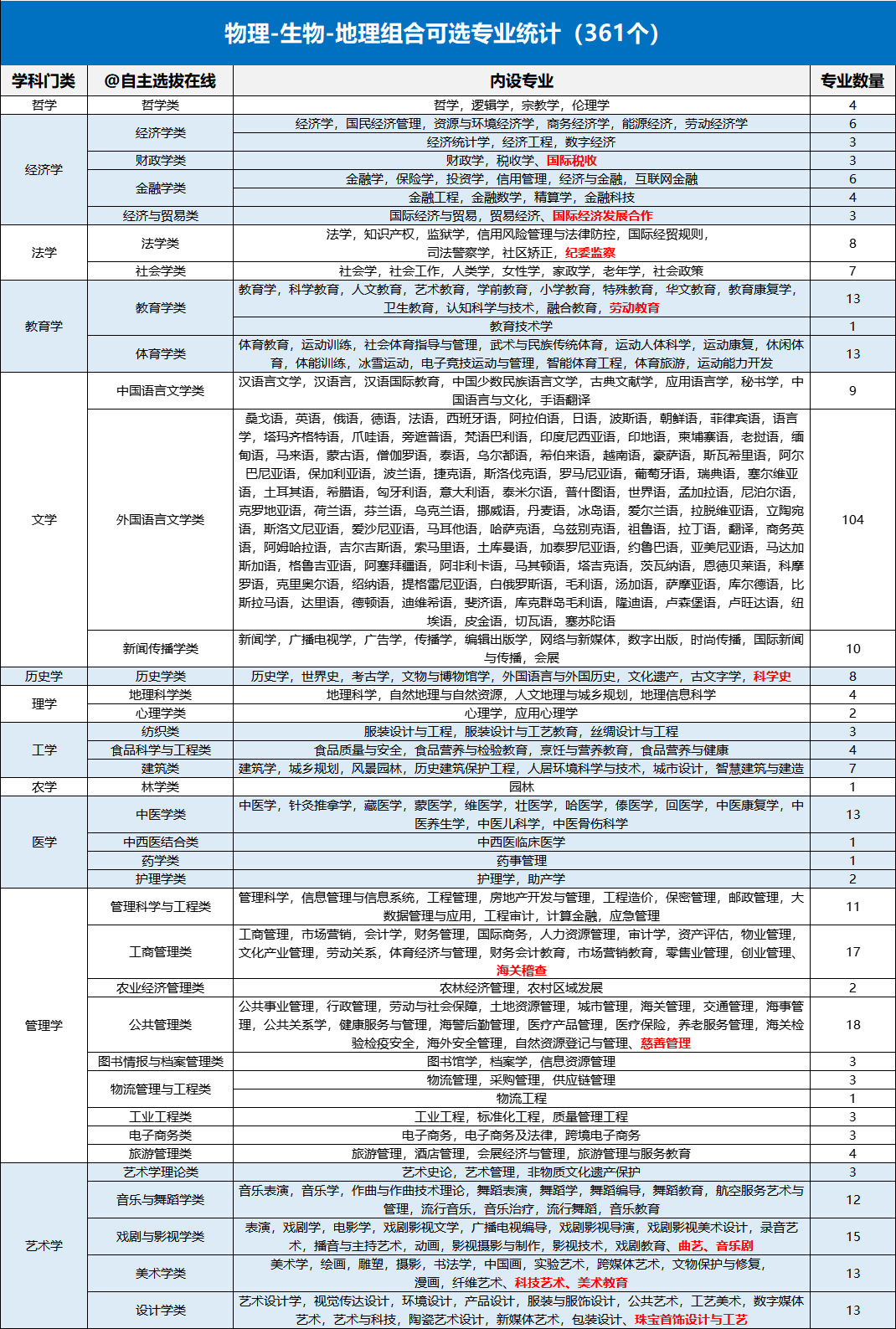 物理-化学-地理组合专业覆盖面也较广,可报考专业门类多,理科、工科类的热门专业都可以报考,此外经济类、管理类、农学类、医学也在选择之列。