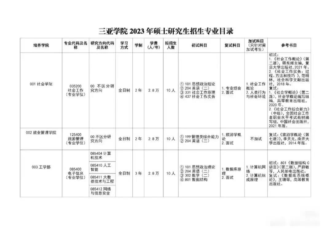 从三亚学院公布的专业硕士招生目录来看,这次招生只有社会工作、旅游管理以及电子信息等三个专业,每个专业的招生人数为10人,全部都是全日制的专硕。