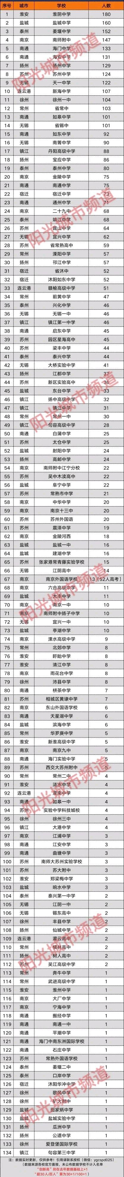 这就谈到了第2个问题从地区来看,特别是前两位盐城和淮安这两所超级中学的存在,但是我们再细心看一下淮安的第二多的学校是76位的盱眙中学,也只有8人,而盐城相对较好:东台中学、射阳中学、阜宁中学等都是两位数。