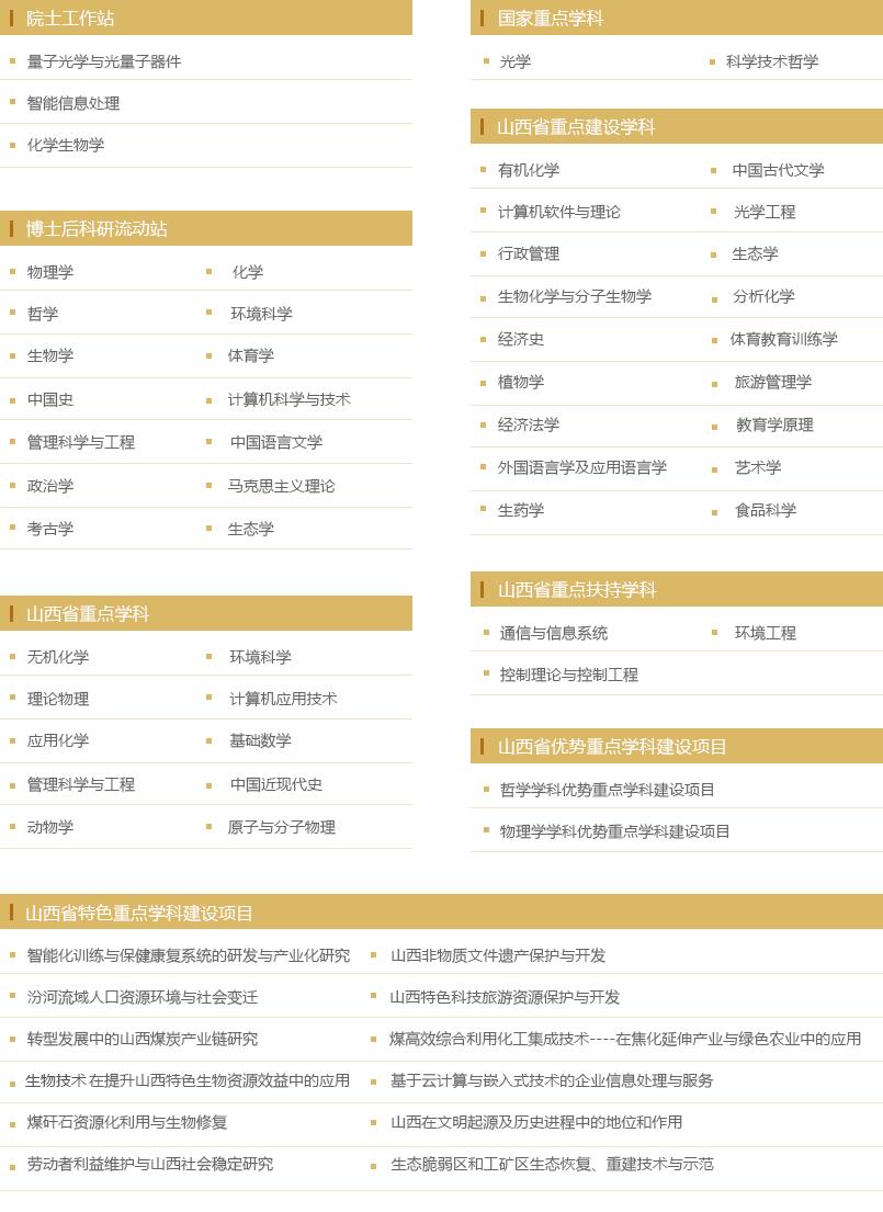山西省品牌专业:电子信息科学与技术、应用化学、信息管理与信息系统、行政管理、光信息科学与技术、会计学、国际经济与贸易、教育学、生物科学、哲学、环境科学、历史学、经济学、法学、汉语言文学、数学与应用数学、物理学、化学、计算机科学与技术
