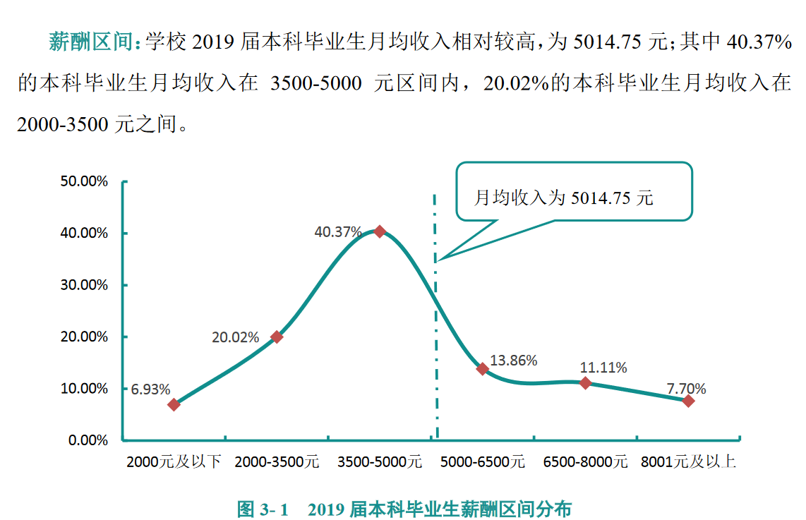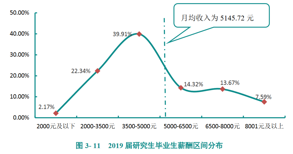 薪酬区间:学校2019届研究生毕业生月均收入相对较高,为5145.72元;其中39.91%的研究生毕业生月均收入在3500-5000元区间内,22.34%的研究生毕业生月均收入在2000-3500元之间。