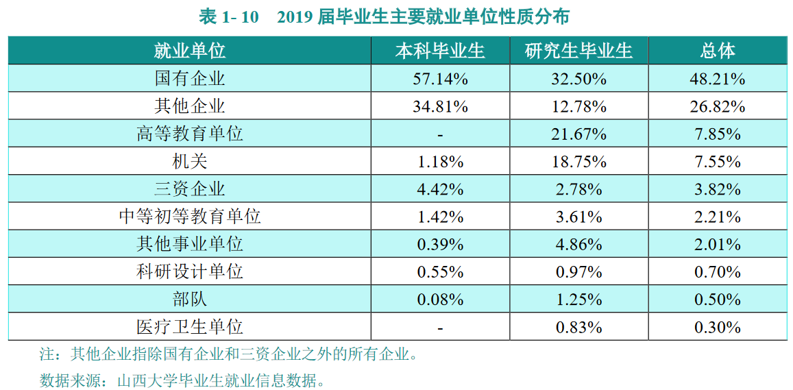 学校2019届本科毕业生单位布局较为集中,主要签约“国有企业”和“其他企业”,占比分别为57.14%和34.81%。研究生毕业生单位流向以“国有企业”为主,占比为32.50%;其次为“高等教育单位”,占比为21.67%。