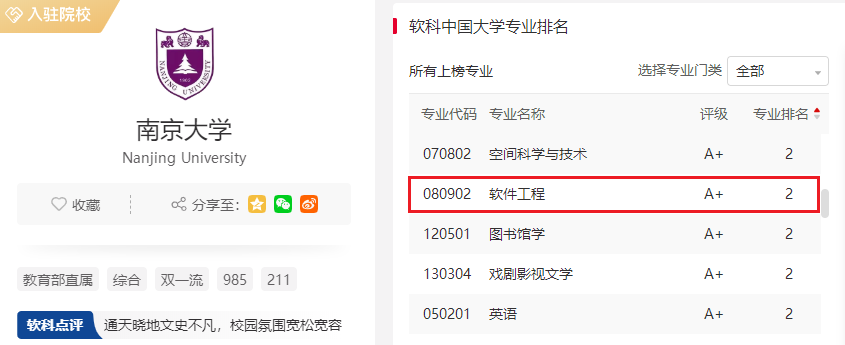软件工程本科专业入选2019年度国家级一流本科专业建设点,入选“十一五”国家级特色专业;软件工程专业硕士是全国工程硕士研究生教育特色工程领域。在软科2021中国大学专业排名中,南京大学软件工程专业位居全国第二名。