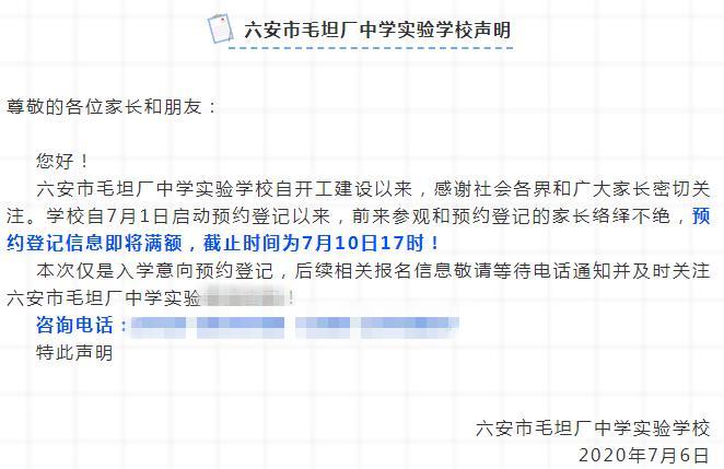 六安市毛坦厂中学实验学校学校自7月1日启动预约登记以来,前来参观和预约登记的家长络绎不绝,预约登记信息即将满额,截止时间为7月10日17时!本次仅是入学意向预约登记,后续相关报名信息敬请等待通知并及时关注!
