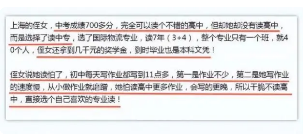 这是一位网友在网上分享的侄女的故事,初中每天写作业到11点多,怕读高中作业更多,干脆不读高中,直接选一个自己喜欢的专业读。