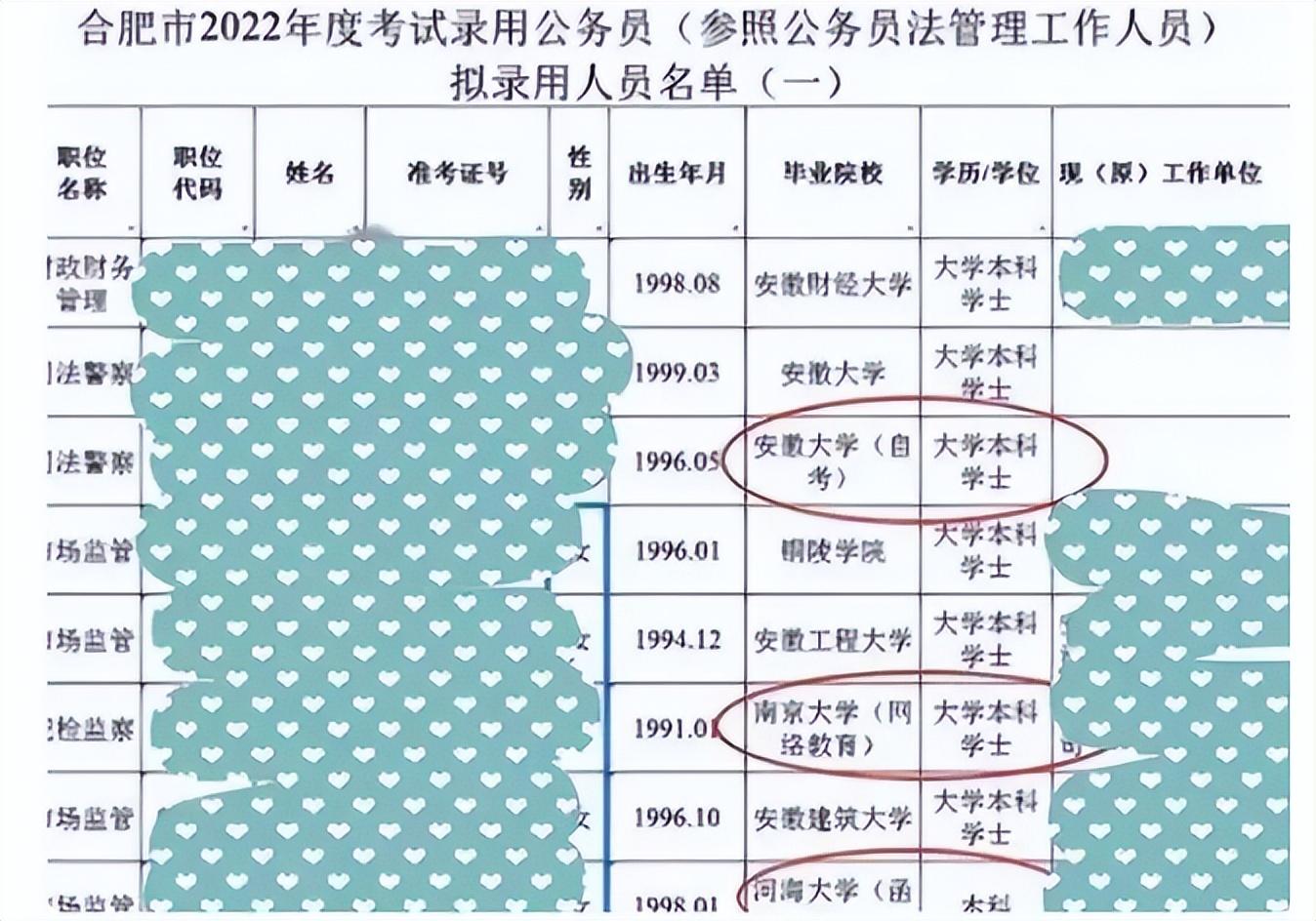 其次,考公、考研是不看第一学历的,比如2022年安徽一份公务员录取名单中,8人中就有3人是自学本科,第一学历并不高,但是却能成功上岸,因此也能看出考公对于第一学历的态度。