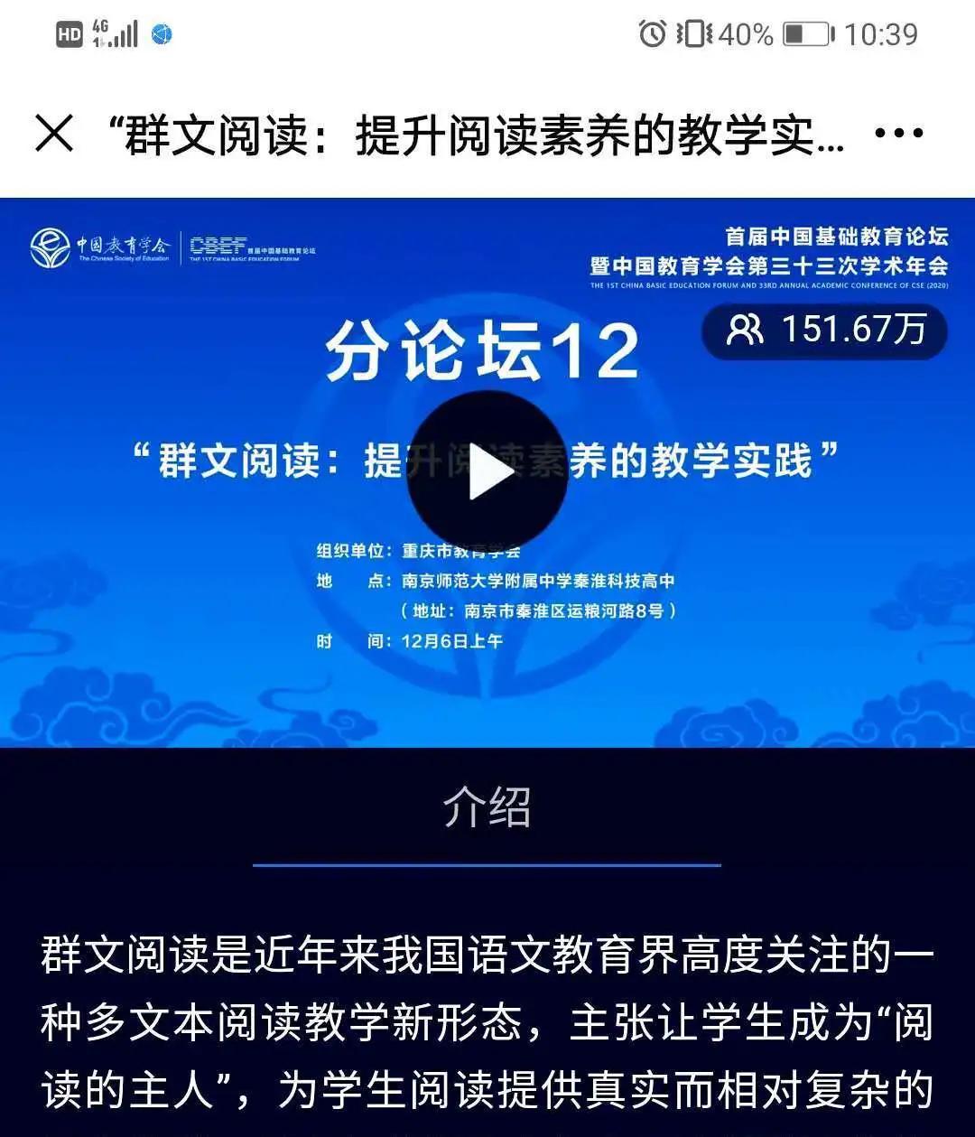 “今天,我们借助本次中国教育学会学术年会的契机,通过分论坛的形式,共话群文阅读在提升阅读素养上的意义价值与典型实践。”