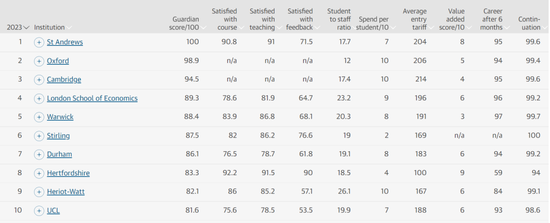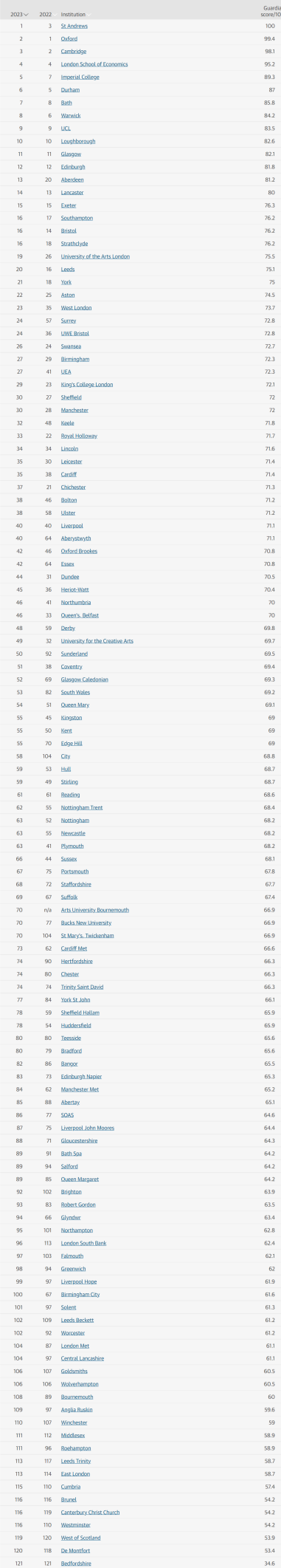 圣安德鲁斯大学在2020年《卫报》排名中位居第1,在2021年和2022年的排名中分别位居第2位和第3位。