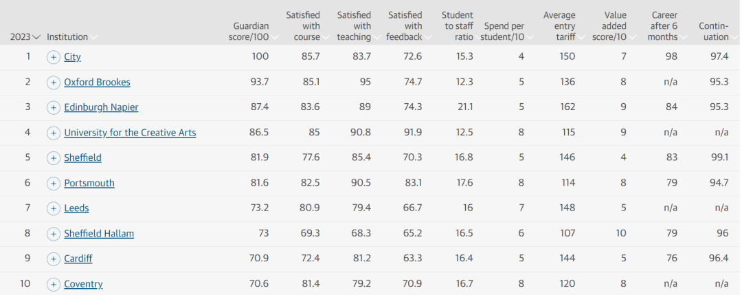 从Top 11-Top 30的排名中可以看到,有些上榜的学校虽然并不是很有名,可能很难出现在其他类型的榜单中,但它们都排在了《卫报》的前30名,比如西伦敦大学和西英格兰大学等,说明这些大学有很好的真实入读体验,这非常加分。