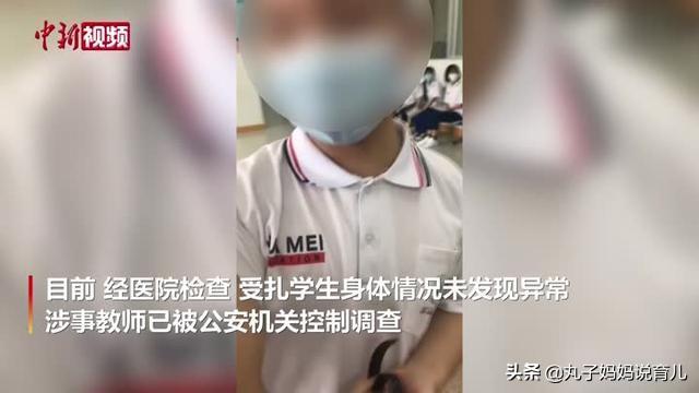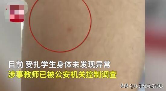 经过医院检查,受扎学生身体情况未发现异常,涉事教师也已被公安机关控制调查。
