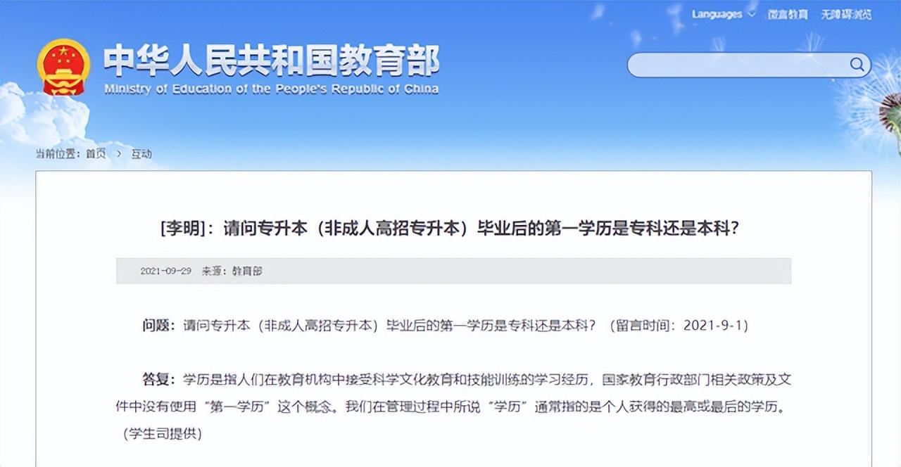 2021年9月29日,教育部针对网友在9月1日的提问“请问专升本(非成人高招专升本)毕业后的第一学历是专科还是本科?”进行了答复。
