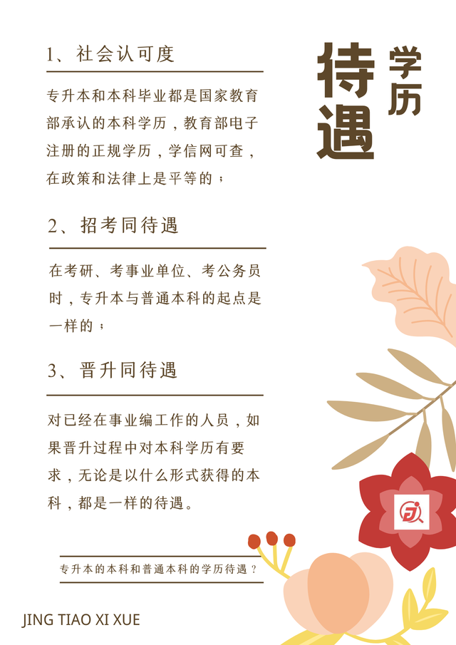 专升本的本科可以和普通本科一样得到国家层面认可的学历待遇,但在面对升学和找工作的竞争时,仍可能会遭遇所谓学历的歧视,尽管它并不合理,但却真实存在。