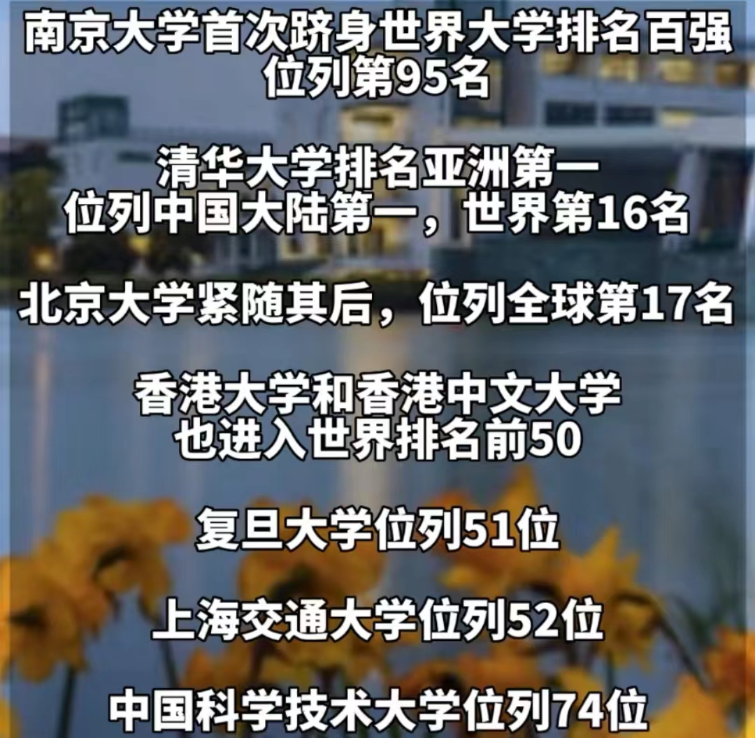浙江大学位居第67名,中国科技大学位居第74名。南京大学也光荣入榜,首次进入全球前100的排名,位居第95名。这些高校真是给国人争了不少脸,谁还敢诋毁我们。