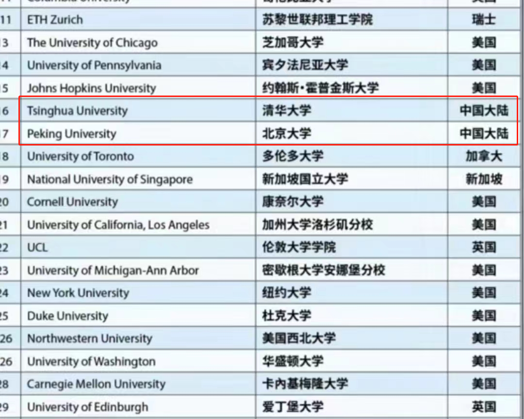 北大也不甘落后,仅仅这清华的步伐,在世界排第17名,这也是非常值得骄傲的。数据中也显示,上海复旦大学和上海交通大学也依旧入了百强榜,分别占据51和52的名次。