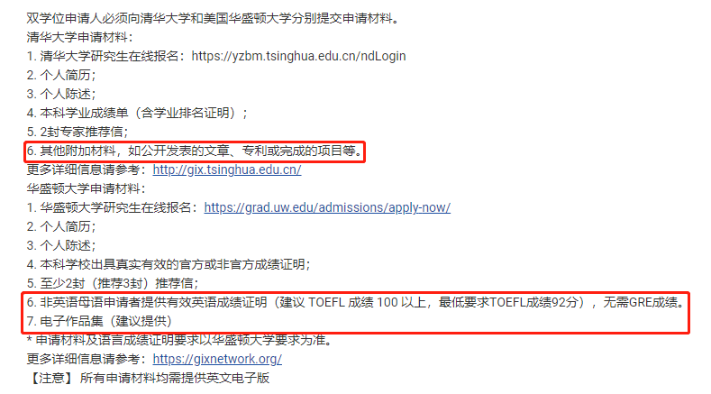 需要同学们牢记的是GIX申请时是需要分别向清华大学和华盛顿大学提交申请的,两所院校索要的素材可能会有一些细微的差别: