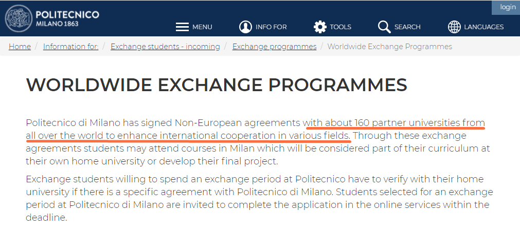米兰理工大学作为一所顶尖的意大利院校,一直致力于与多国院校开办学术交流或合作项目。在全球交流计划页面,米理炫耀似的宣布自己的全球合作院校多达160所,遍布不同领域。