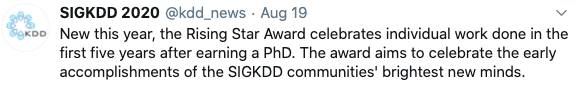 今年是KDD第一届设立年度新星奖(Rising Star Award)。