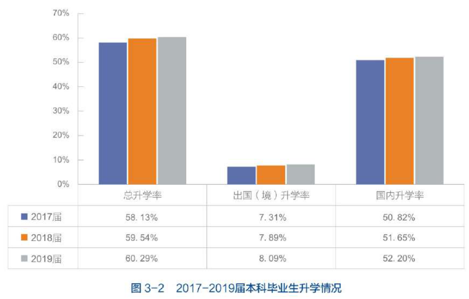 2019届本科毕业生中,有1710人选择国内升学,占毕业生总人数的52.20%;有265人选择出国(境)深造,占毕业生总人数的8.09%