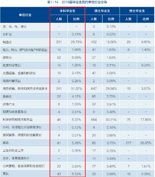 按签约行业划分,2019届本科毕业生签约的主要行业是:信息传输、软件和信息技术服务(31.02%)、制造业(29.73%)、建筑业(6.69%)。