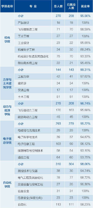 按培养单位来统计,所有学院的就业率均超过了90%,其中就业率较高的院系是:生命学院(100%)、教育实验学院(100%)、力学与土木建筑学院(99.31%)、自动化学院(98.06%)。