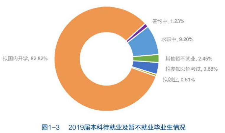 2019届本科毕业生待就业共163人。其中2人正在签约中(1.23%),15人正在积极求职(9.20%),6人准备公务员考试(3.68%),1人准备创业(0.61%);暂不就业毕业生139人,135人不就业拟国内升学考试(82.82%),4人其他原因暂不就业(2.45%)。