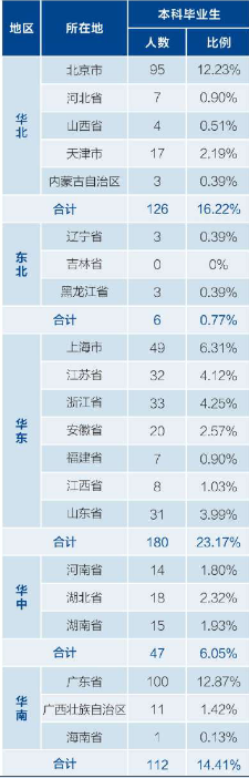 本科毕业生就业人数排在前5名的省份是:陕西省(26.64%)、广东省(12.87%)、北京市(12.23%)、上海市(6.31%)、浙江省(4.25%)。