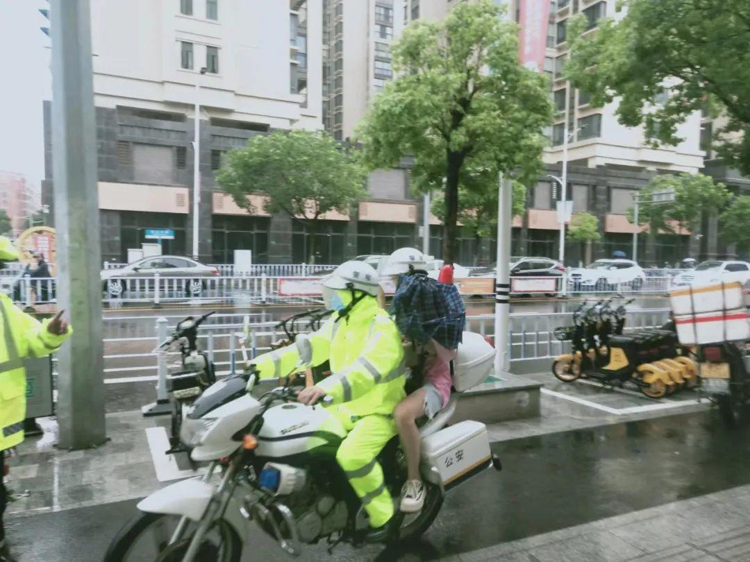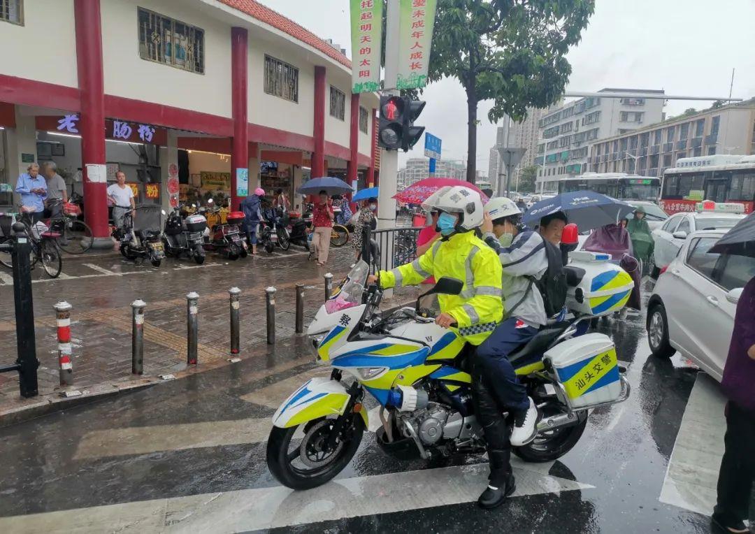 在金平区,上午7时42分,交警金平大队一中队执勤民警接一名考生求助,称由于雨势过大打不到车,现急需前往汕头市第二中学考场参加考试。交警铁骑立即前往,在指定地点接到考生后火速将其安全送达考场,考生得以顺利参加考试。