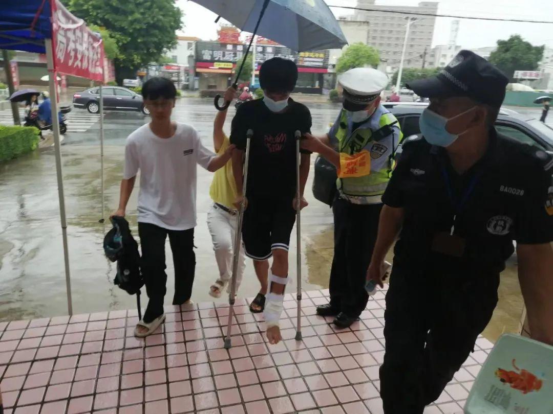 上午8时许,交警潮阳大队执勤民警在潮阳林百欣中学考点执勤时,发现一考生大腿受伤行动不便,民警立即上前搀扶考生,护送其进入校门口。