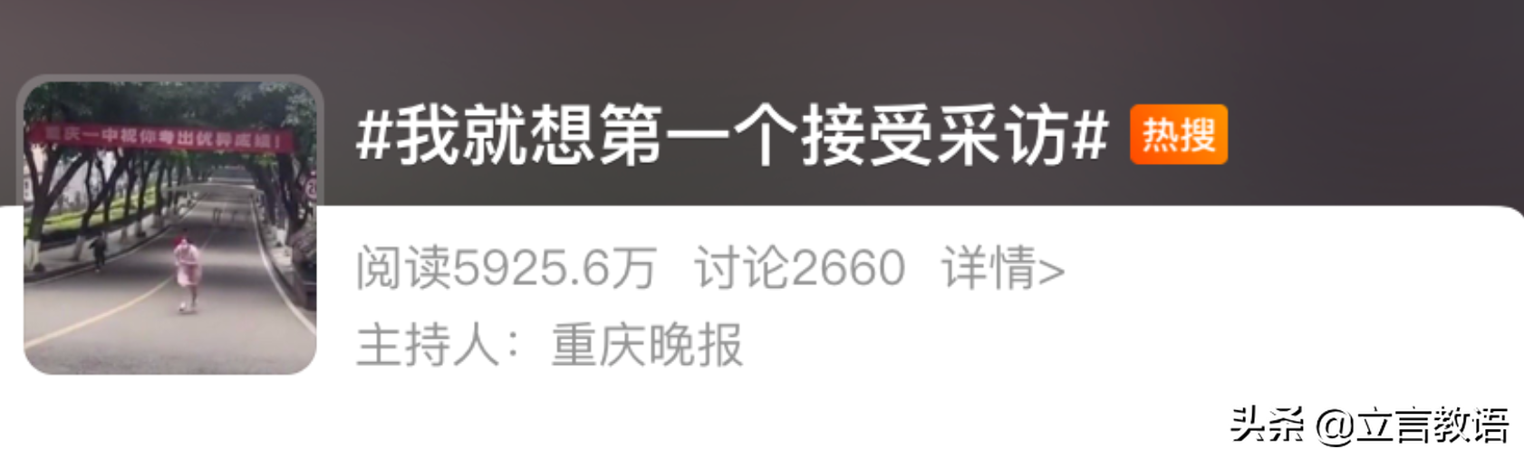 另外,在另外一处考场,走出来一位对自己成绩很自信的学霸,他上热搜的方式就和上面那位段同学不一样了。
