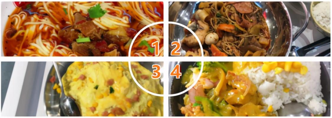 四食堂的新疆风味美食深受同学们的好评,店面不大,菜式却不少,如大盘鸡拌面、丁丁炒面、干煸炒面等等。此外,自助旋转火锅也吸引了不少火锅爱好者。同时,四食堂还提供自助餐,各式各样菜品,主食、餐后甜品、糕点等一应俱全。