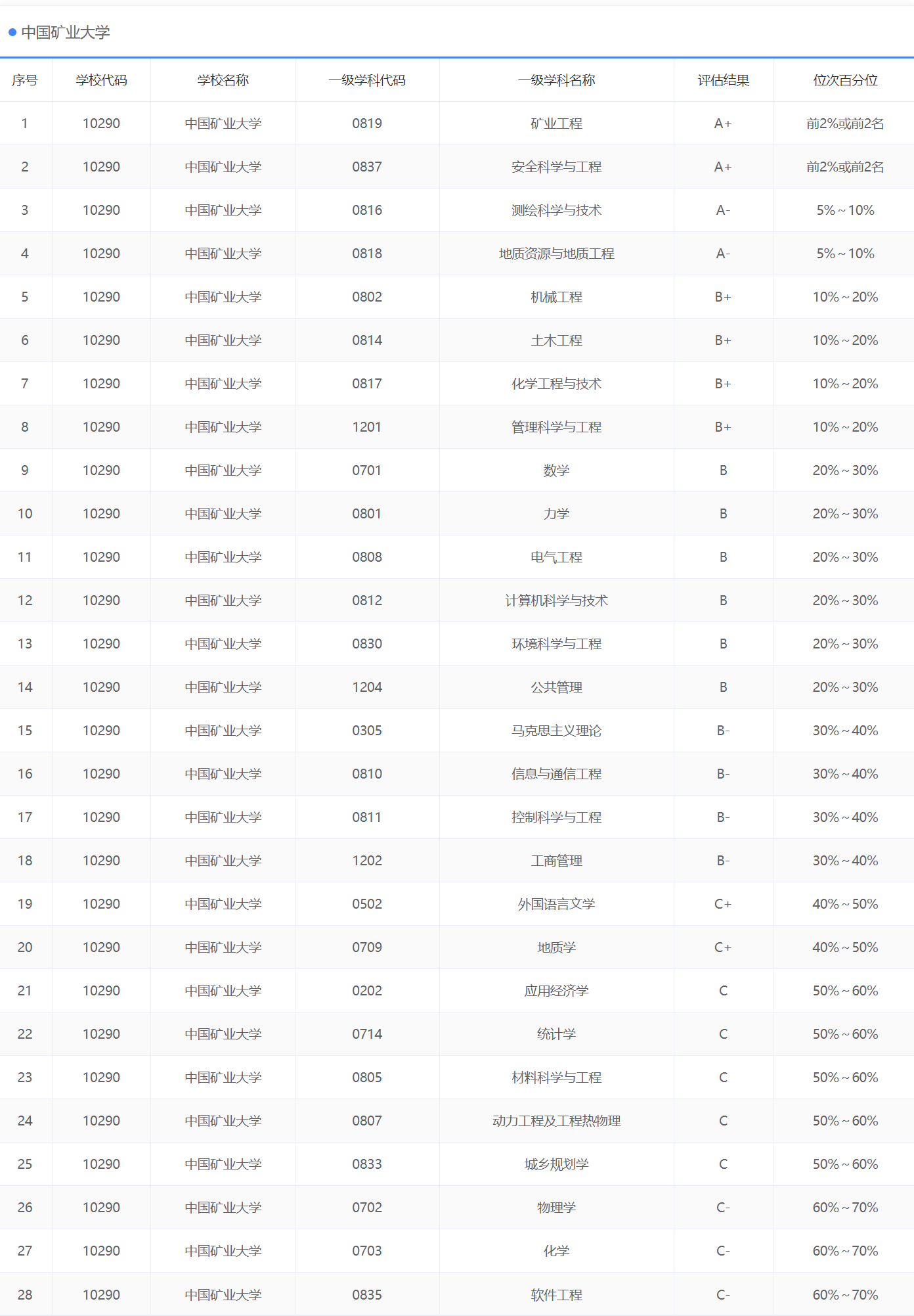 再来看一下第四轮学科评估结果,在榜单上我们只能看到一个中国矿业大学,没有中国矿业大学(北京),最终的结果当然是好的,毕竟两所大学一起申报:中国矿业大学A+档学科数在全国高校中排名并列第22位,A类学科数在所有大学工学门类评估成绩中排名第20位。其中,矿业工程和安全科学与工程继续全国领先(A+),测绘科学与技术、地质资源与地质工程全国排名第三(A-)。