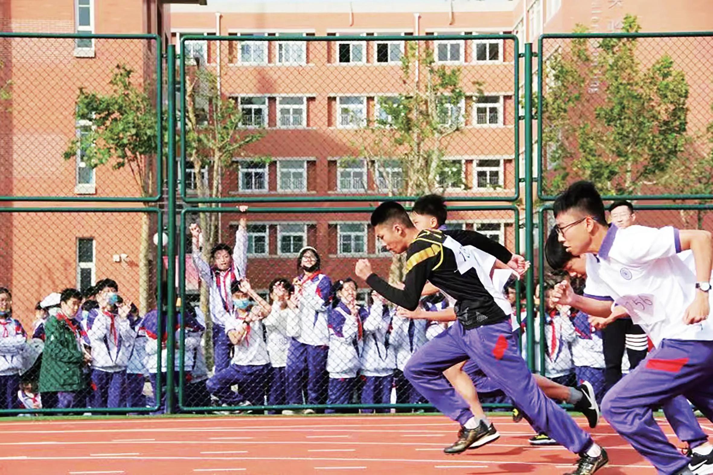 “注重强健体魄”是南开精神的传承特色。南开系列学校创始校长张伯苓被誉为“中国奥运第一人”,他曾发出“强国必先强种,强种必先强身”的时代强音。学校立足学生视角,以学生十二年的成长历程为出发点,以“健康第一”为理念,设计了“阶梯式”体育活动,将课程设计聚焦于提高体育核心素养,增强运动能力、培育健康行为、塑造体育品德。学校将400米8跑道的专业田径场划分为跳绳、羽毛球及毽球、足球过杆、软式排球、跑步、仰卧起坐及深蹲开合跳六个功能区,学生可以利用碎片时间,随时使用专业运动器械进行锻炼,并采用班级轮换的形式,增强体育锻炼的多样性和趣味性,营造“爱运动、会运动、爱生活”的氛围。