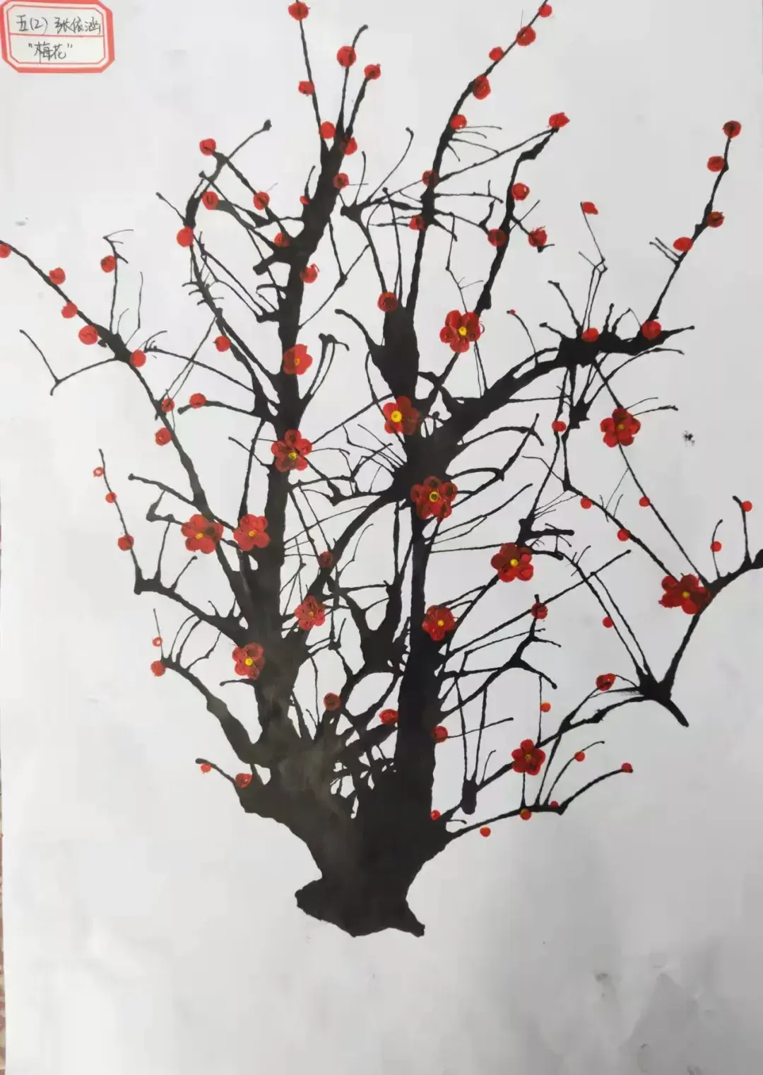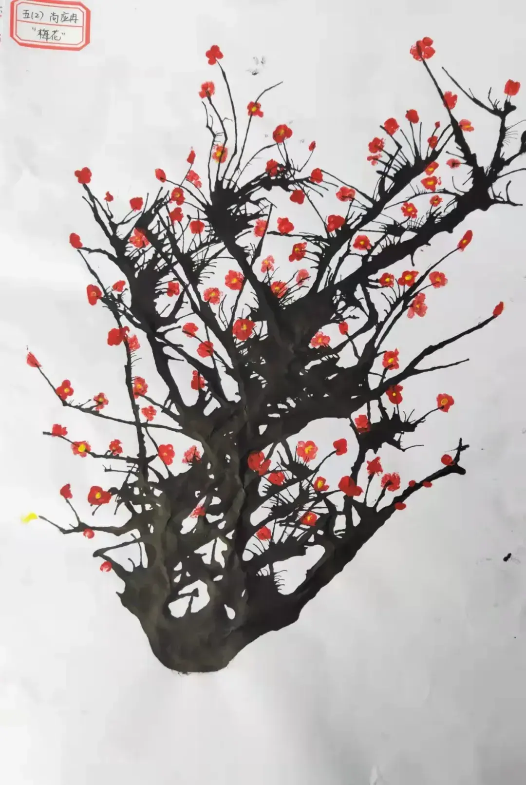 白纸,墨枝,红梅,远远望去,恰似漫步一片梅海。一幅幅红梅,一张张笑脸,映着冬日暖阳,承载着孩子们的小小成就,装扮着多彩校园。