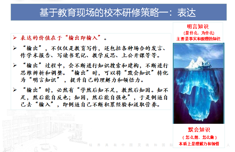 毛道生校长对校本研修从表达、对话、内省三个阶段进行讲解: