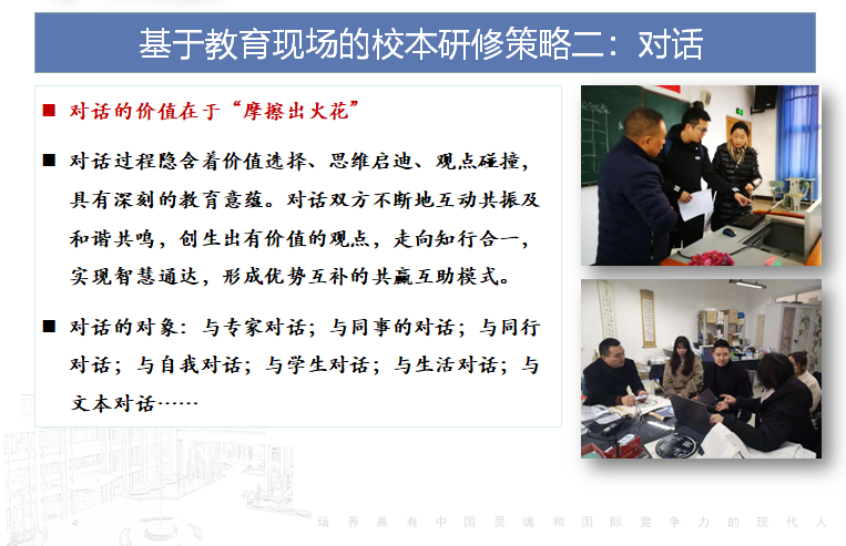 校本研修必须基于现场,只有在现场才能焕发活力,基于现场的校本研修是干品质学校建设的核心推动力。