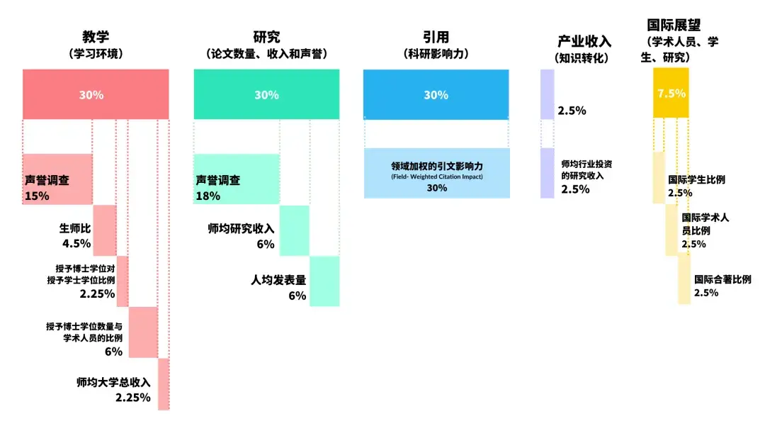 绩效指标分为5个方面:教学(学习环境);研究(论文数量、收入和声誉);引用(科研影响力);产业收入(知识转化);国际展望(学术人员、学生和研究)。