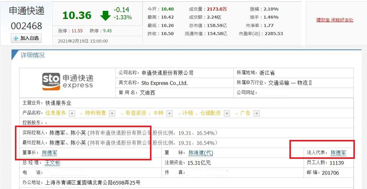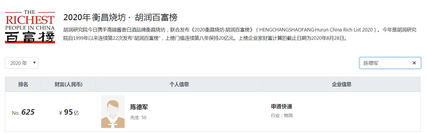 公开资料显示,陈德军,1970年出生,浙江桐庐人,本科学历,现任申通快递股份有限公司实际控制人、董事长、法人代表。2020年10月20日,陈德军以95亿元人民币财富名列《2020衡昌烧坊·胡润百富榜》第625位。