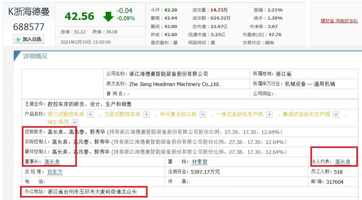 公开资料显示,高长泉,1959年10月出生,浙江台州玉环人,工商管理专业专科学历,现任浙江海德曼智能装备股份有限公司控股股东、实际控制人、董事长、法人代表。兼任浙江海德曼智能装备股份有限公司子公司玉环通快执行董事兼经理、凹凸人监事,浙江海德曼智能装备股份有限公司股东虎贲投资执行事务合伙人、高兴投资执行董事和经理的职务。