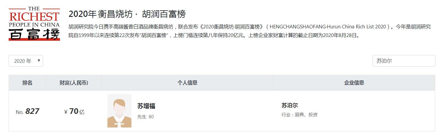 公开资料显示,苏增福,1941年出生,浙江台州玉环人,经济师,现任苏泊尔集团董事长,兼任浙江苏泊尔实业发展有限公司董事长、浙江可立思安制药有限公司董事长、浙江苏泊尔海运有限公司董事长、玉环大鹿岛旅游开发有限 公司董事长等职。2020年10月20日,苏增福以70亿元人民币财富名列《2020衡昌烧坊·胡润百富榜》第827位。