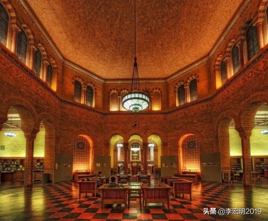 对面的鲍威尔图书馆,是仿造米兰的圣盎博罗削圣殿建筑外观,红砖建筑,有尖顶、圆形拱门和精致图案装饰,图书馆里面有高挑的空间和宽敞的阅览室。这是UCLA的中央图书馆,藏书800万册,是北美地区第三大图书馆。圆形大厅(Rotunda)全年举办各种展览、音乐会和历史舞蹈。