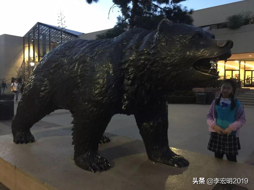 在阿克曼联盟大楼(Ackerman Union)门口,我和著名的熊熊铜像合影。这是学校的吉祥物,全名叫Joe Bruin,象征能力和力量(power and strength)。学校的报纸是DailyBruin,学生证叫Bruin Card,网络系统叫Bruin Online,听说它还有老婆叫Josephine Bruin。