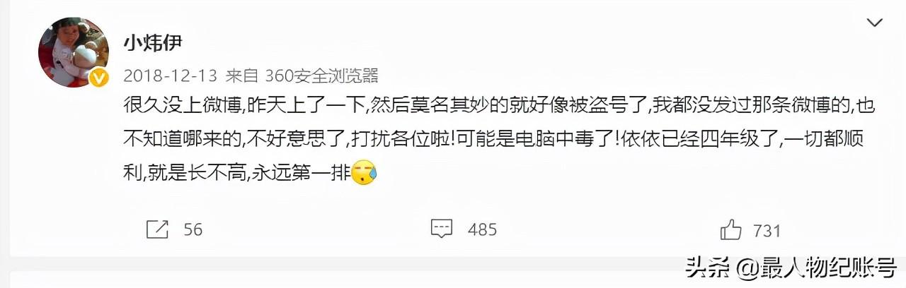 2018年12月13日,叔叔更新微博:伊伊已经四年级了,一切都顺利,就是长不高,永远第一排。
