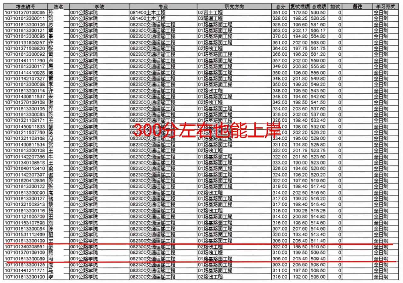 上图为2021年公路学院的拟录取名单,可以看到交通运输工程专业初试最高分是385分,被录取的同学也不乏有300分左右的同学。即便是学校的热门学院下,也有收分一般易上岸的专业。