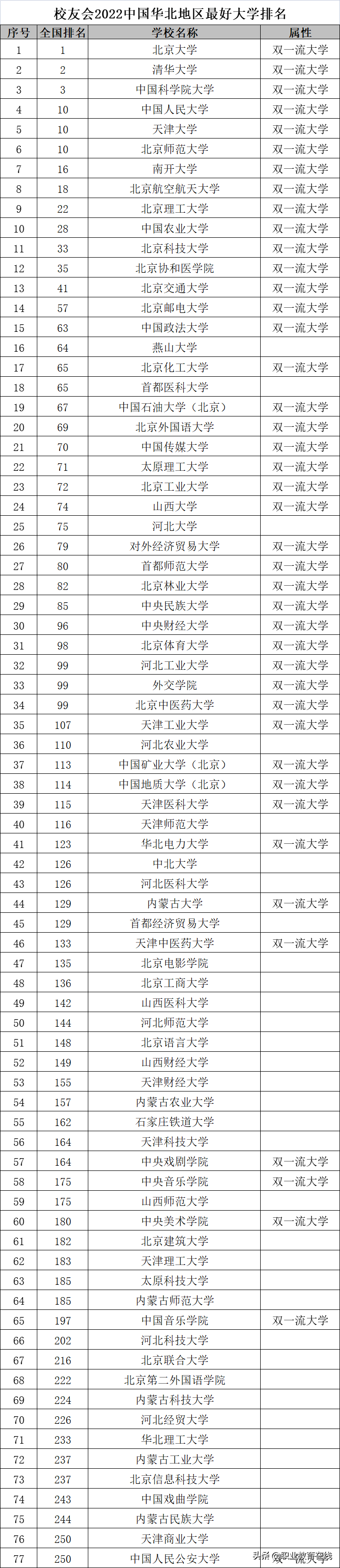 我们分别来看看华北地区的高等院校排名情况: